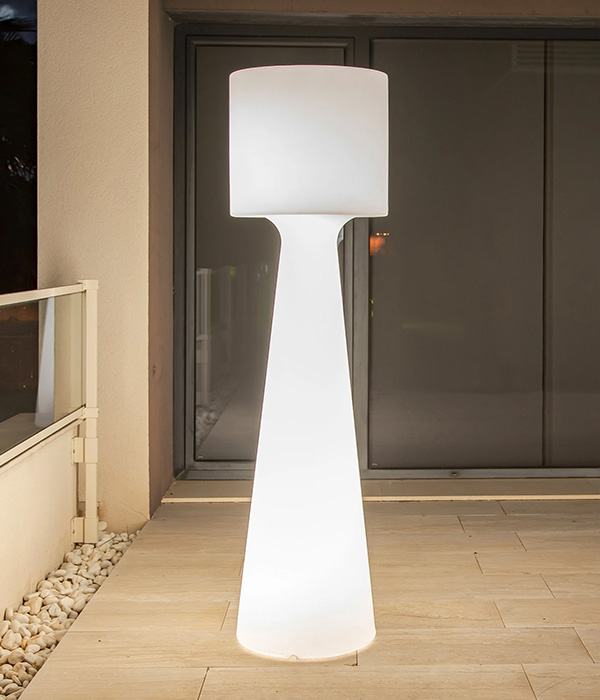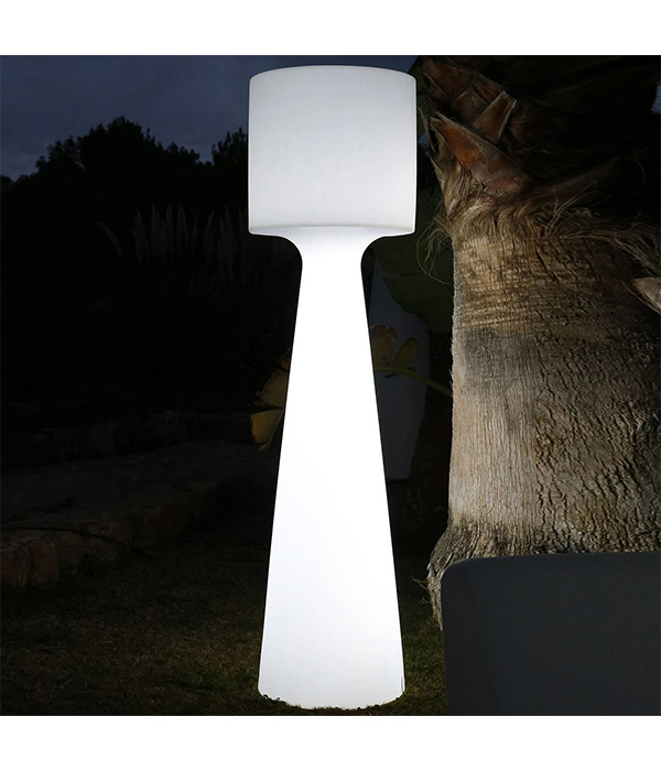 Lampa stojąca LED Horizon 140 z akumulatorem. Dzięki akumulatorowi lampa stojąca LED Horizon 140 może być używana w dowolnym miejscu w domu lub na zewnątrz bez konieczności podłączania i bez uciążliwego kabla. Idealnie nadaje się również do oświetlania tarasów w hotelach lub zewnętrznych stref gastronomicznych. Dzięki wbudowanym w oprawę diodom LED RGB i białym diodom LED oraz pilotowi wchodzącemu w zakres dostawy, projekt oświetlenia jest niezwykle elastyczny. Lampa stojąca LED może nie tylko zapewniać różne barwy światła, ale także jasne światło dzienne o temperaturze 6500 K, a natężenie światła można regulować bezstopniowo. Materiał polietylenowy, z którego wykonana jest lampa, podobnie jak wszystkie produkty hiszpańskiego producenta, jest bardzo wytrzymały, odporny na ekstremalne temperatury i promieniowanie UV, co w połączeniu z nowoczesną lampą LED gwarantuje długą żywotność.