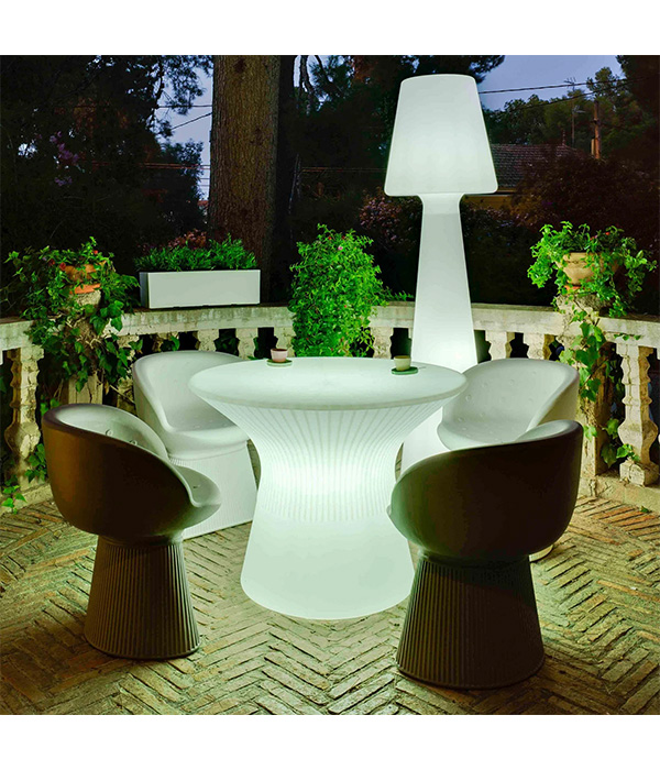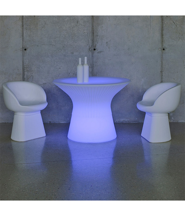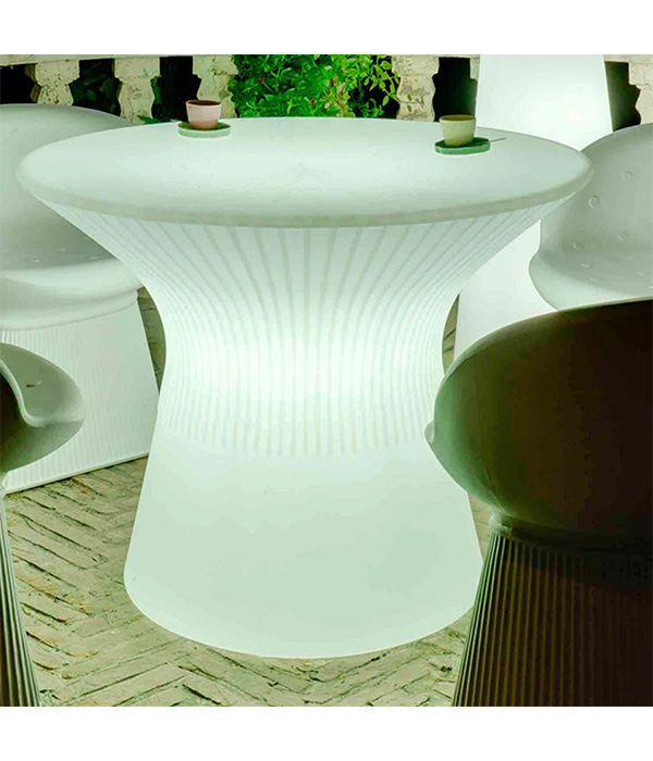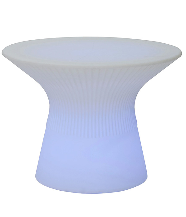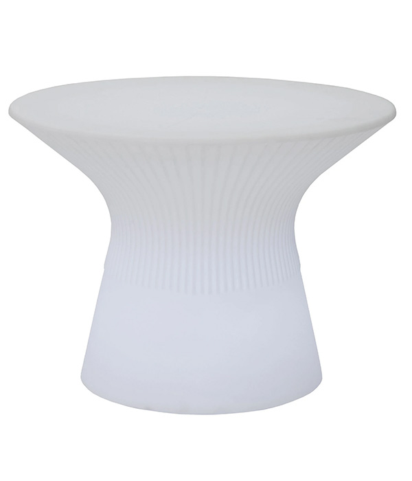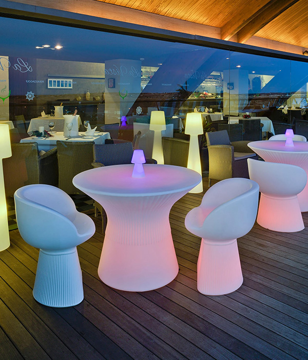 Świetlny stół Mercury 73 do użytku wewnątrz i na zewnątrz uzupełnia chillout lounge w pomieszczeniach lub na zewnątrz, w środowisku prywatnym lub komercyjnym. Stolik o pięknym kształcie z żłobkowaną podstawą wykonany jest z tworzywa sztucznego - polietylenu. Materiał ten, stosowany przez producenta do produkcji niemal wszystkich wyrobów, charakteryzujący się odpornością na promieniowanie UV i wytrzymałością w skrajnych temperaturach, sprawia, że stół jest solidnym meblem do użytku wewnętrznego i zewnętrznego. W zestawie znajduje się metakrylowa nakładka chroniąca powierzchnię. Wyposażony w panel słoneczny i akumulator wewnątrz stołu, zainstalowane kolorowe i białe diody LED mogą świecić bez żadnych kosztów. W dni, kiedy światło słoneczne nie wystarcza do naładowania akumulatora, można go również ładować z gniazdka za pomocą dostarczonego kabla ładującego, aby zapewnić maksymalny czas świecenia wieczorem. Ustawienia światła stołu można wygodnie regulować za pomocą pilota, który wchodzi w zakres dostawy.